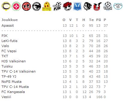 | Joukkue | O | V | T | H | Maaliero | Pisteet |